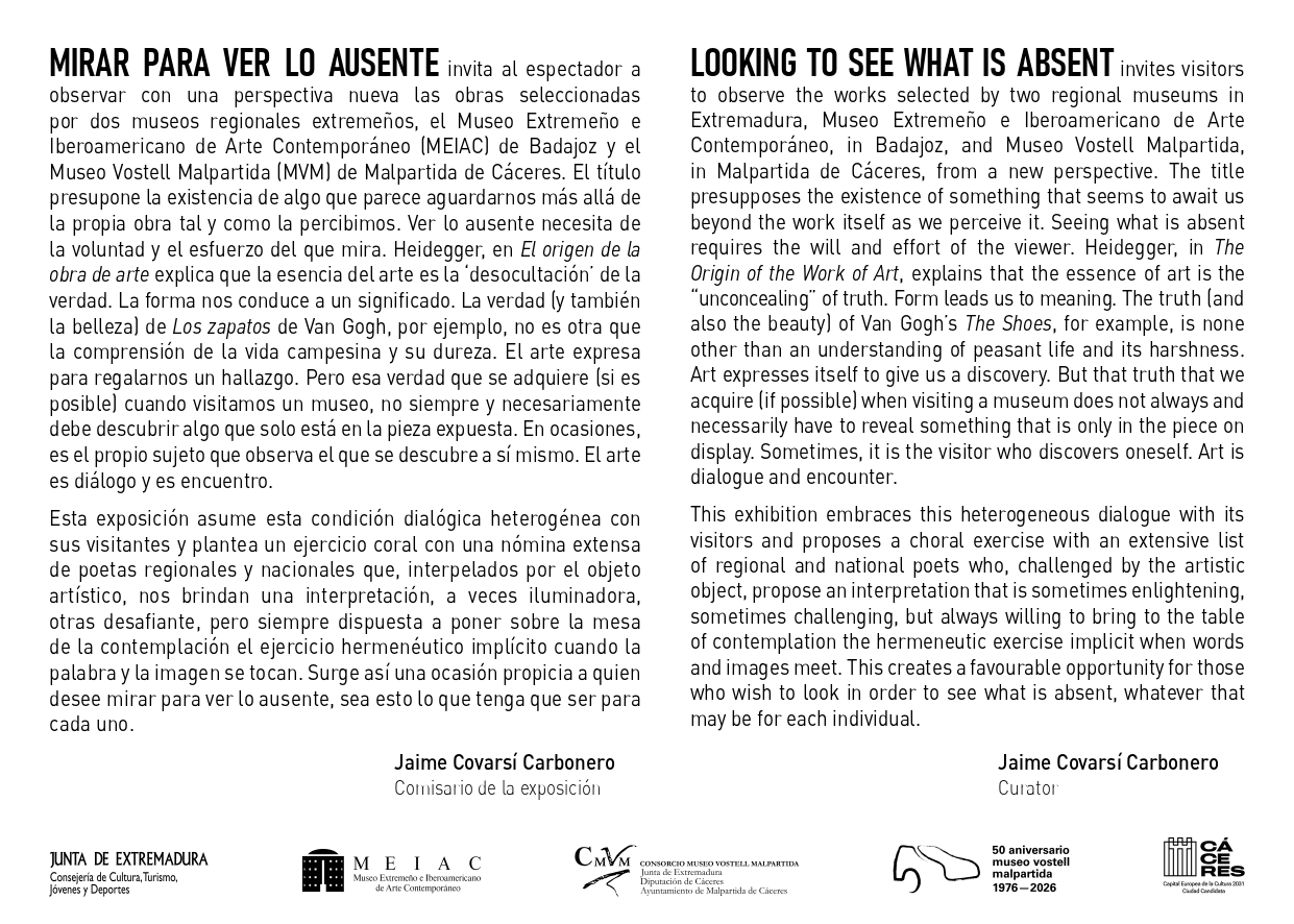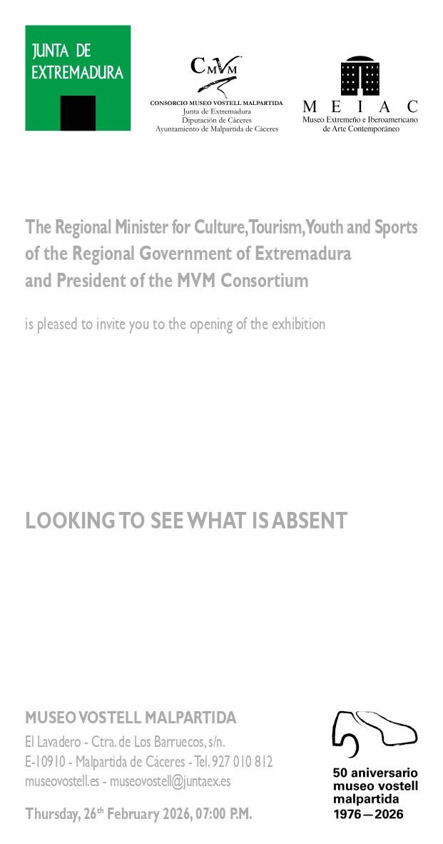 El próximo jueves, 26 de febrero de 2026, a las 19:00 h, el Museo Vostell Malpartida acogerá la inauguración de la exposición Mirar para ver lo ausente, en un acto institucional presidido por la Consejera de Cultura, Turismo, Jóvenes y Deportes de la Junta de Extremadura y Presidenta del Consorcio Museo Vostell Malpartida.